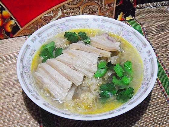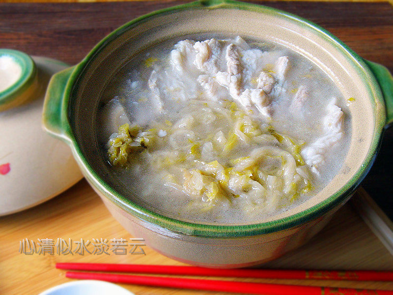 6:放入酸菜,炖到酸菜软烂,加入盐,鸡精出锅。菜软汤鲜。吃的时侯加点韭菜花。