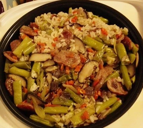 2:腊肠切片,豆角手成小段、西芹斜切段,香菇切片,洋葱和胡萝卜切丁。
