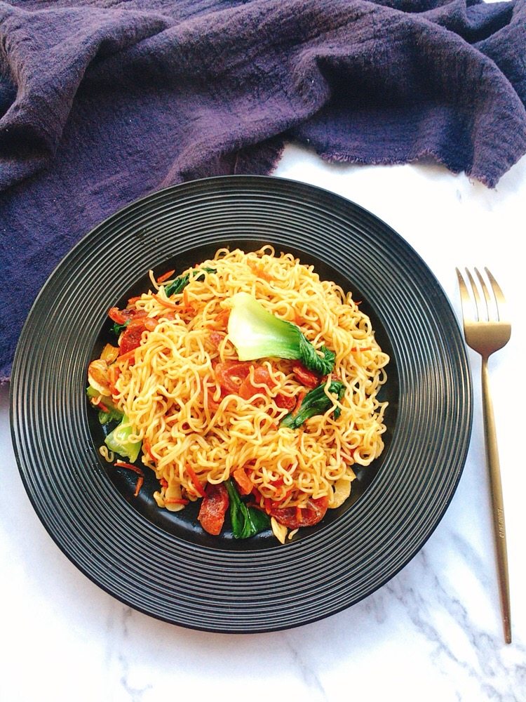 8:放入方便面,加入生抽和鸡汁,翻炒均匀即可。