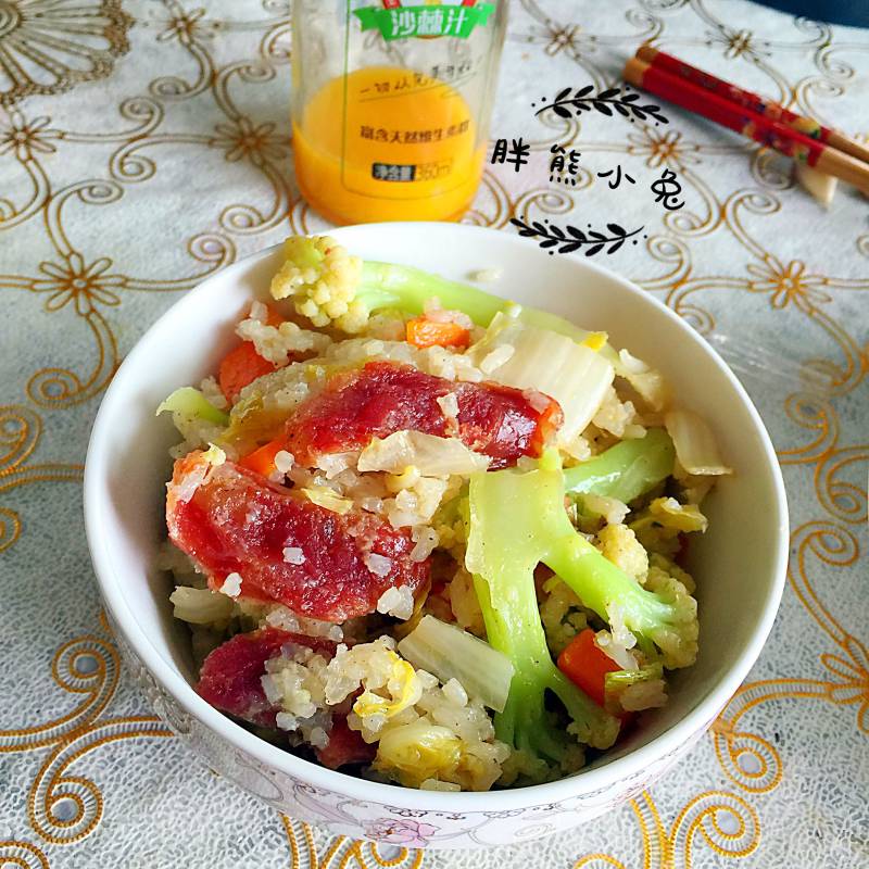 米饭适量;娃娃菜适量;胡萝卜半根;菜花适量;腊肠2小根;