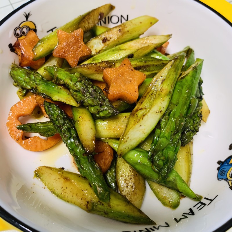 6:放入芦笋和胡萝卜片加少许生抽煸炒。