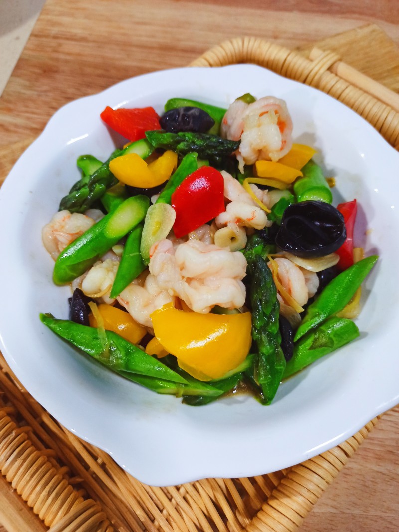 虾仁12只;芦笋6根;彩椒适量;黑木耳适量;