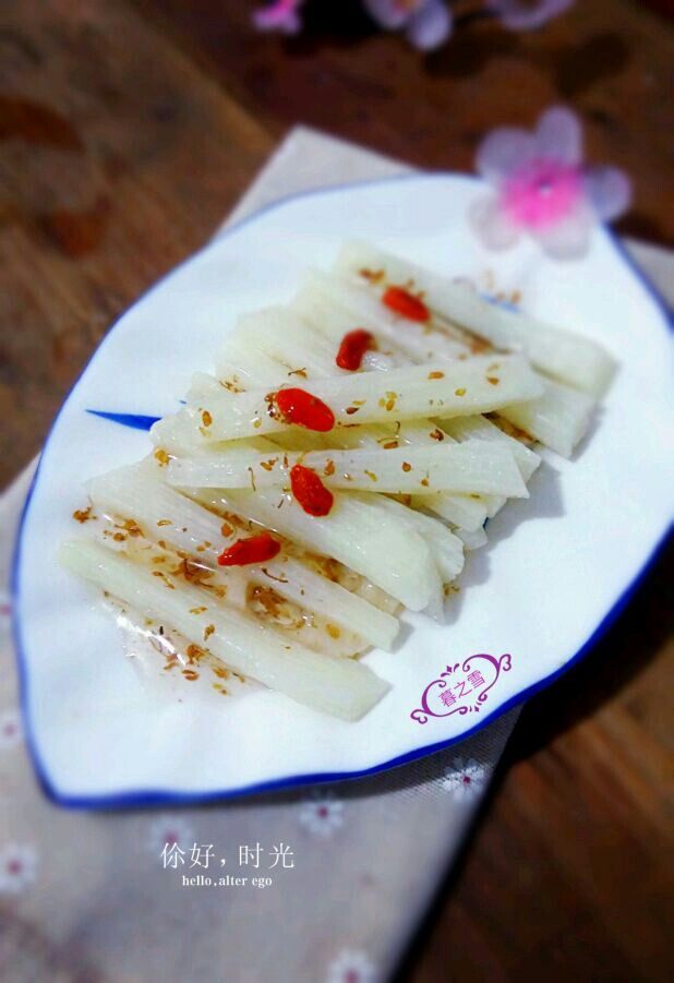 6:数小时后,上好色的山药,切斜片装盘,撒上适量的糖桂花即可。
