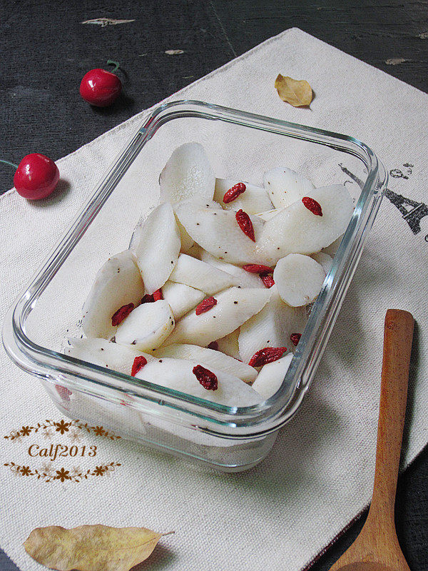 2:把山药去皮切段,再切片。盆里加上清水,滴几滴白醋在水里。把山药片放进水里浸泡备用。