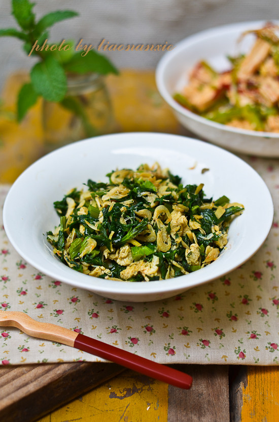 3:焯水后的芹菜叶淋水切碎,鸡蛋打散,虾皮洗净挤去水。