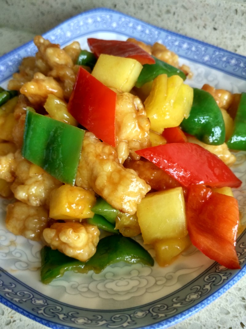 3:炒锅加少许油,菠萝放入,中火炒约2分钟,放入青红椒,两克盐,两大勺番茄酱炒匀待辣椒熟,放入鸡丁大火翻炒半分钟出锅!