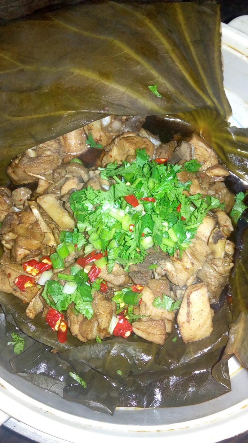 3:把拌匀后的鸡肉放到铺开的荷叶上包好,多余的边边可以压到盘子下面哦