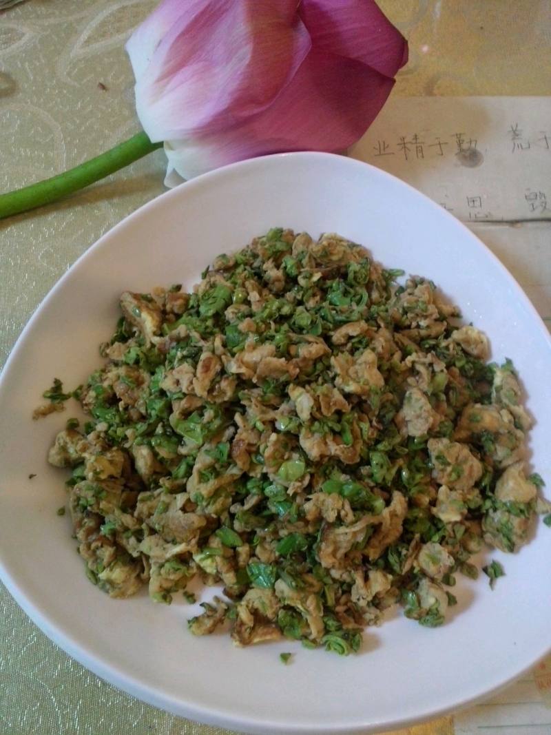 11:将炒好了的荷叶鸡蛋加入少量鸡精,起锅。这样一盘清香荷叶炒蛋就做成功了。