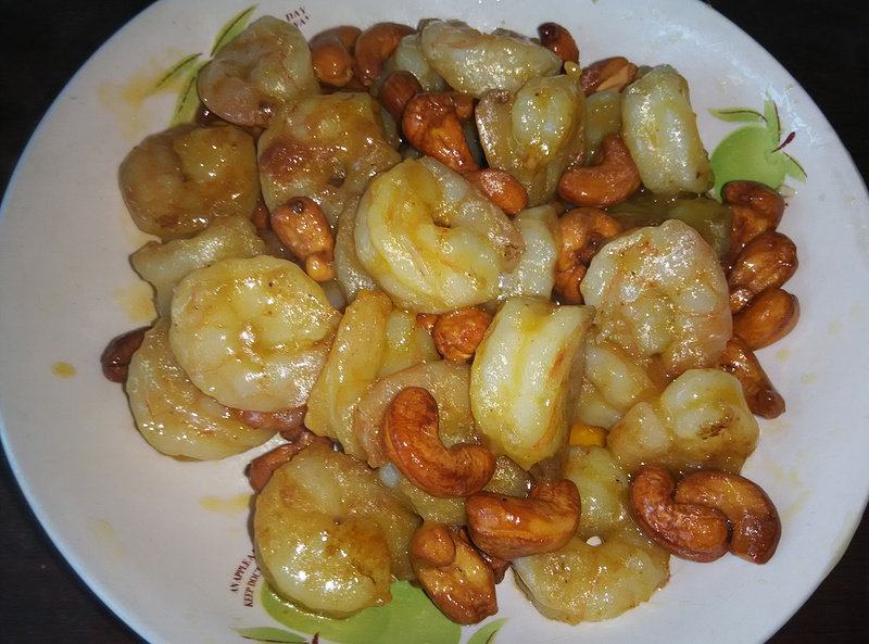 5:5、原锅放少量油,加葱、蒜、姜、番茄酱,糖,加醋、盐、汤、倒虾仁、腰果、颠锅,淋香油,出锅即成。