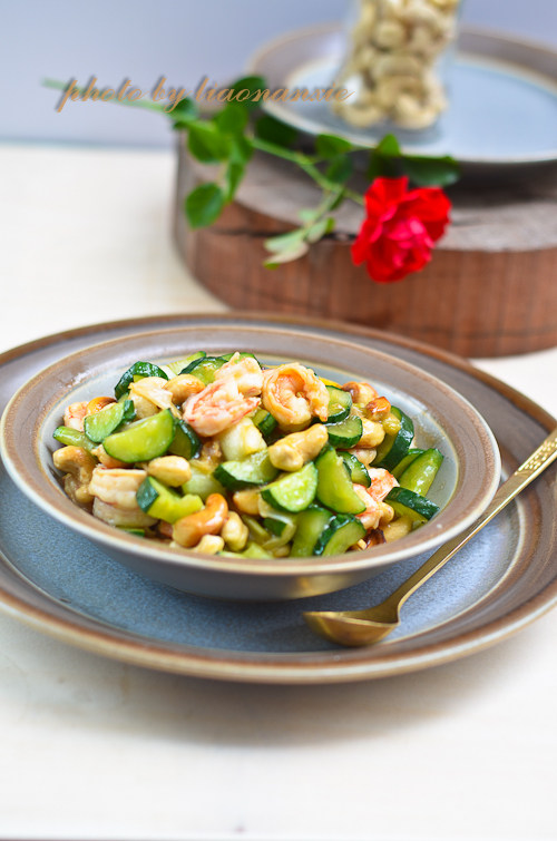 自家吃的菜,能少用油就少用油,腰果干炒就可以了。腰果跟花生是一样的,生熟都可以吃的。黄瓜可以去皮,也可以不去皮,这个比较随意,用盐抓腌后再清洗,炒出来口感较好。虾仁加盐清洗,可以去腥,而且虾仁颜色比较好看。