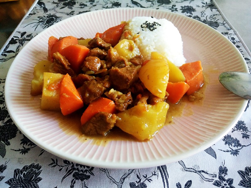 1:牛肉洗净切麻将小点的块,胡萝卜洋葱土豆切滚刀块,我用的是有咖喱,大约两三勺