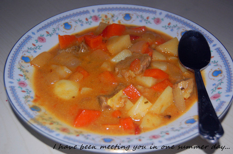 7:加入牛肉汤和咖喱,中小火炖制10分钟左右。