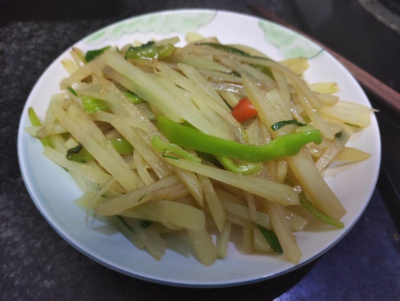 5:放油,葱蒜,土豆丝,青椒翻炒,依次加入生抽,醋,盐,鸡精即可。