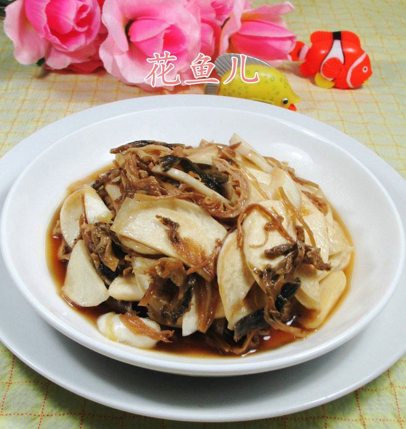 5:接着,合入泡好的笋干菜(并加适量的泡笋干菜的汤汁)。