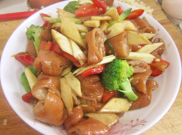 3:倒入红辣椒西兰花翻炒,再倒入肥肠,到生抽蚝油盐调好味......