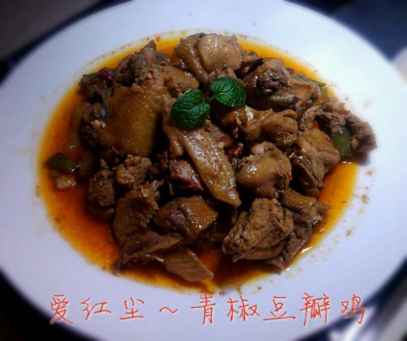 5:加入冷水淹过鸡肉。大火烧开后转中火不加盖煮至水余一半时,加入青椒、姜片、辣豆瓣、泡尖椒,煮至水快收干,起锅装盘。