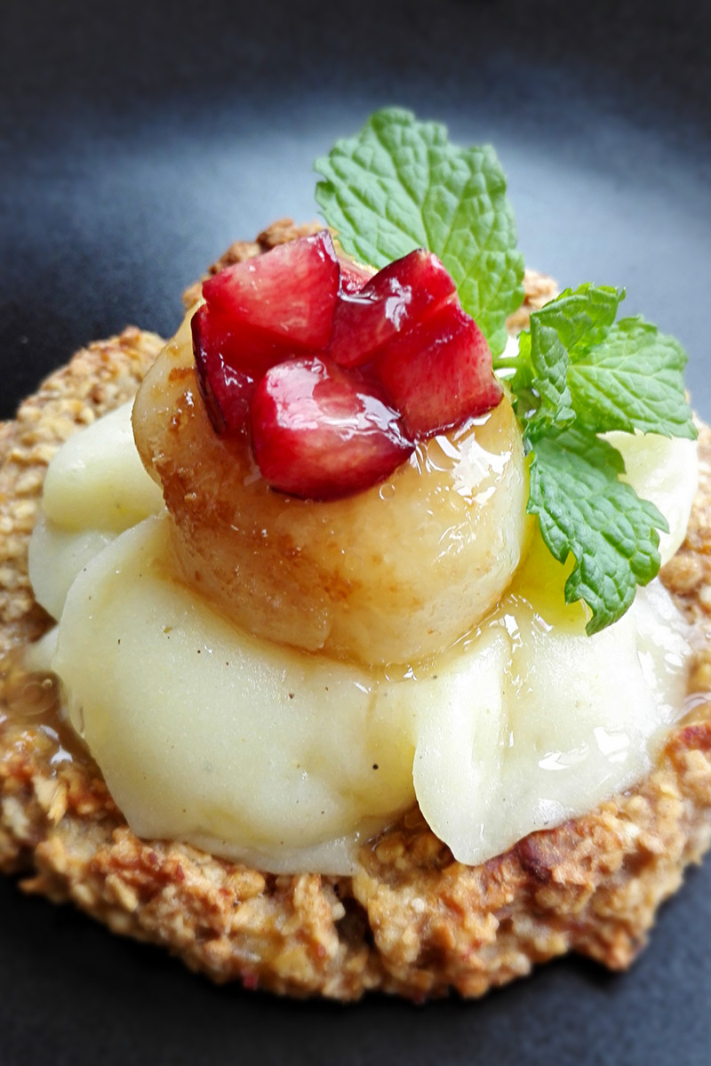 6:最后,在燕麦饼上裱上五瓣花,放上瑶柱,切点樱桃碎,装饰即,瑶柱上我又烧的浇汁,和鸡汁原理一样。