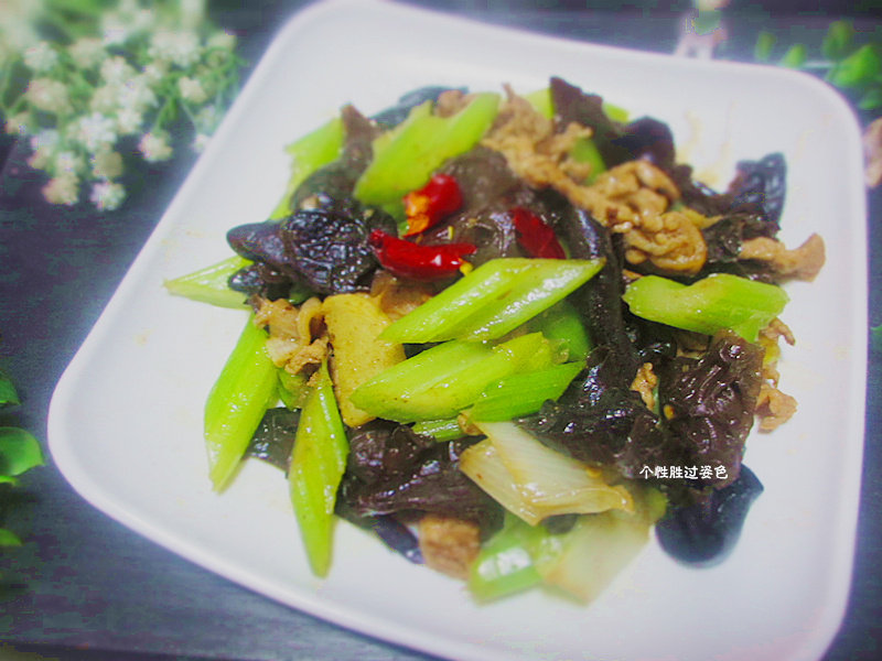 木耳1小吧;肉200g;芹菜300g;