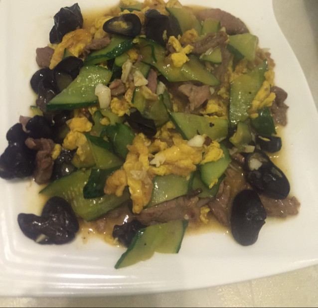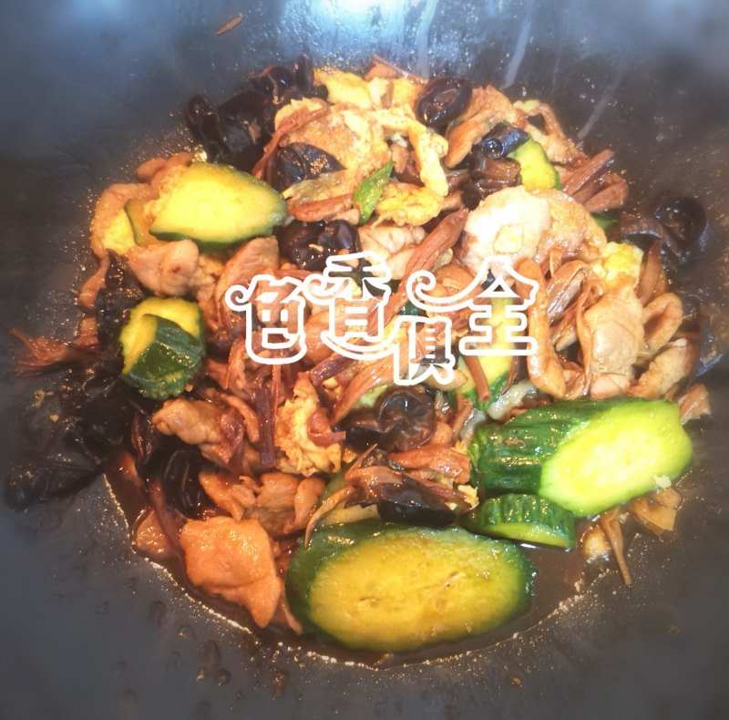 8:倒入木耳片,炒香,加入鸡蛋,瘦猪肉,黄瓜片,放盐,蚝油,酱油。