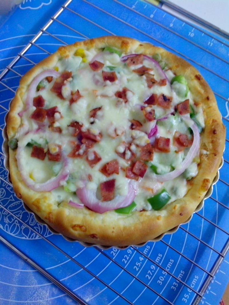 披萨饼一个;培根适量;