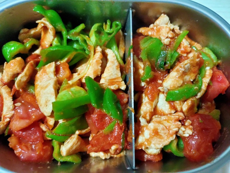 5:起锅热油,先倒入西红柿翻炒出沙,再加入鸡肉和青椒,加两勺生抽,1g盐,半勺糖,翻炒均匀。