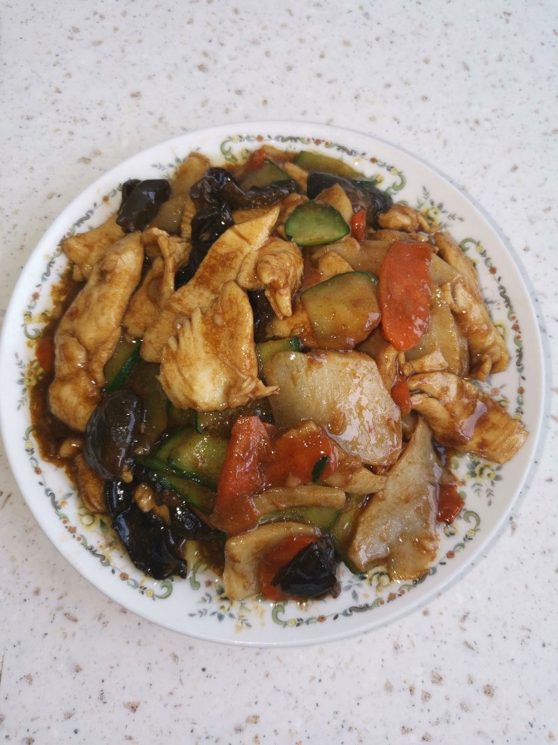 9:木耳基本炒熟后,放鸡肉片,沿锅边倒入调好的料汁,迅速翻炒。