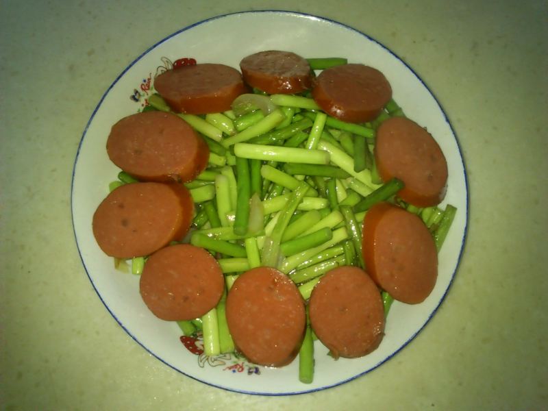 4:下烤肠和适量盐翻炒,蒜苔不要炒老,反超芸均后,下味精即可关火出锅!