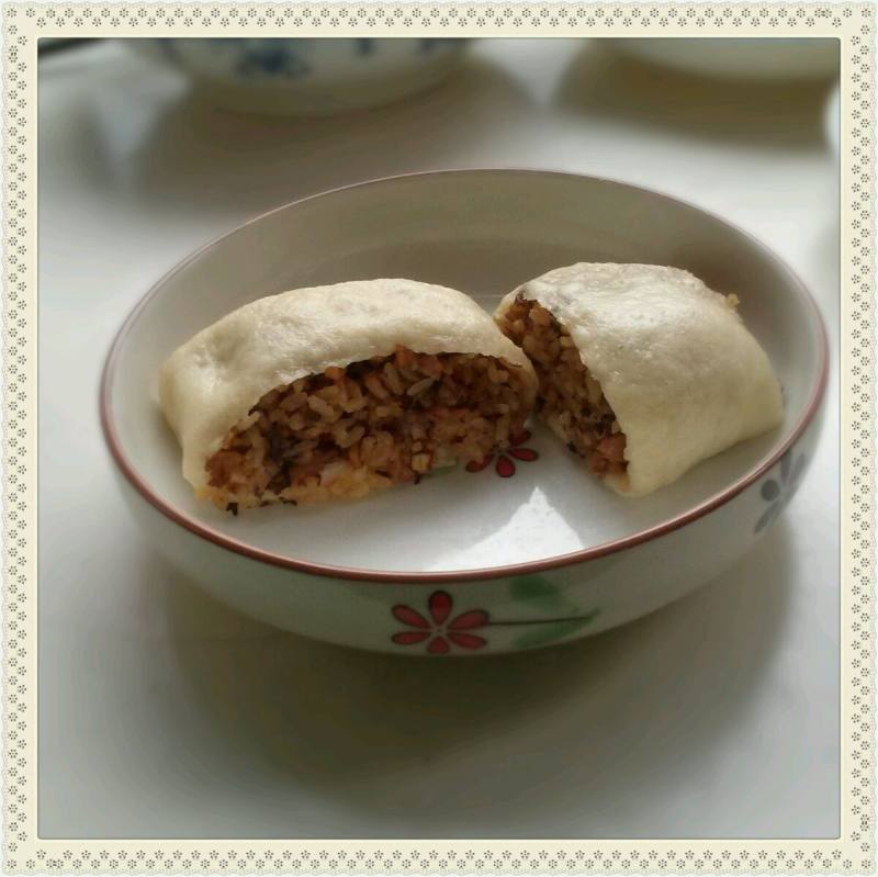 1:在糯米饭中加入熟虾米、熟肉沫,调入盐、鸡精、糖、猪油拌匀,压成长条形;