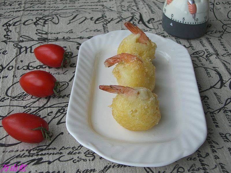 5:取土豆泥适量,放一个虾,虾尾留外面