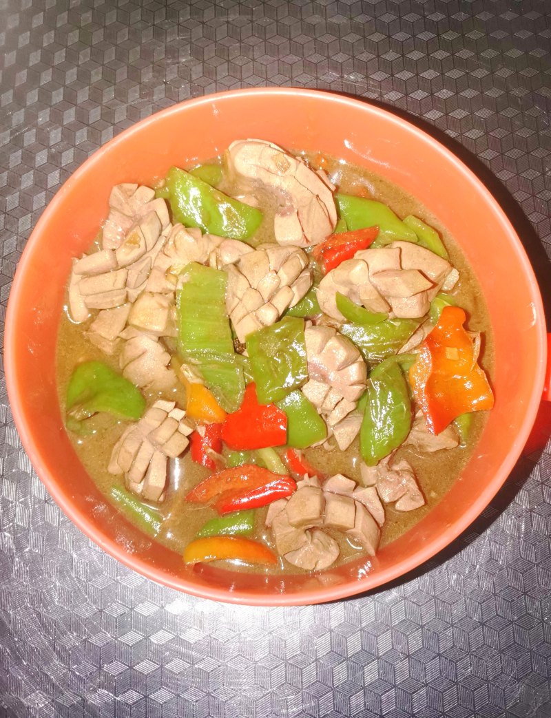 14:将青红椒洗净切片,重新至锅热油,下入辣椒加少许食盐翻炒至断生,淋入刚炒好腰花中的汤汁。