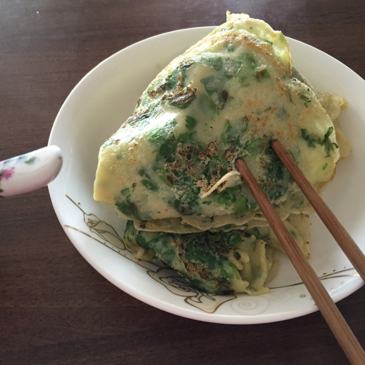 注意面糊中面粉和水的比例,太稠的话煎饼容易碎,所以稀薄的面糊可以煎得很有弹性。