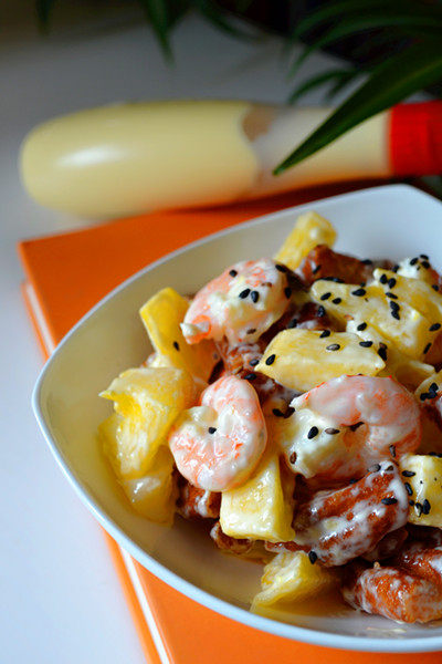 3:虾和油条,菠萝混合在一起,挤入适量的沙拉酱