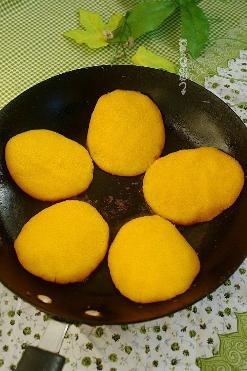 5:和好的玉米面,放电饼铛,淋少许水,盖盖儿焖一会儿。