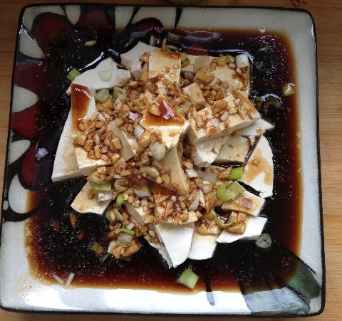 3:豆腐上撒些葱花,然后把调好的料汁淋在豆腐上即可!