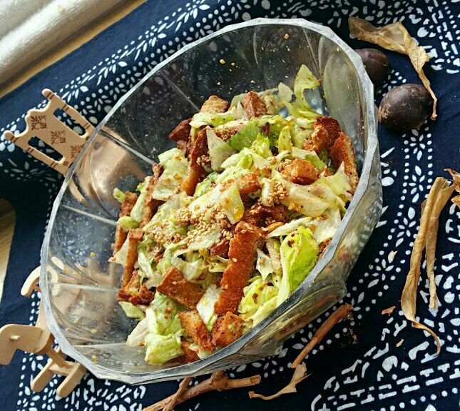 4:将盐、油、醋和蒜末混合加入白菜丝中拌匀;