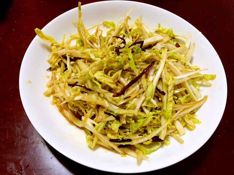 6:白菜丝中加入香菜,淋入椒丝油就可以了。