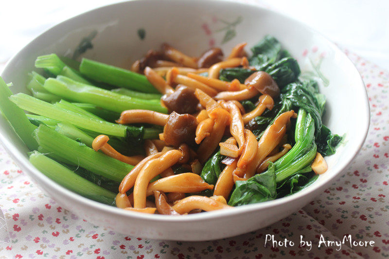 菜心1把;蟹味菇适量;蚝油1勺;酱油2勺;清水适量;