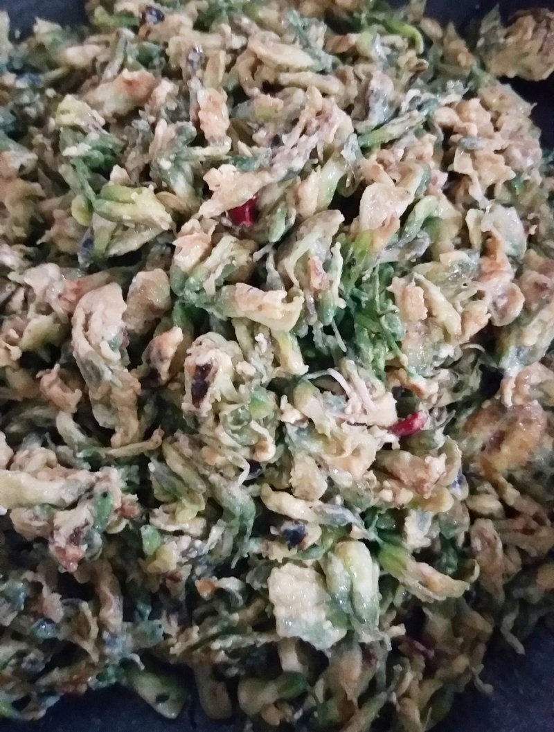 4:调中火,加入槐树花和用热水泡过的枸杞(连那小碟水一起倒入),翻炒。加盐调味。