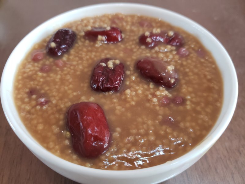 6:煮至米和红豆软烂,加入适量红糖,再熬五分钟左右即可