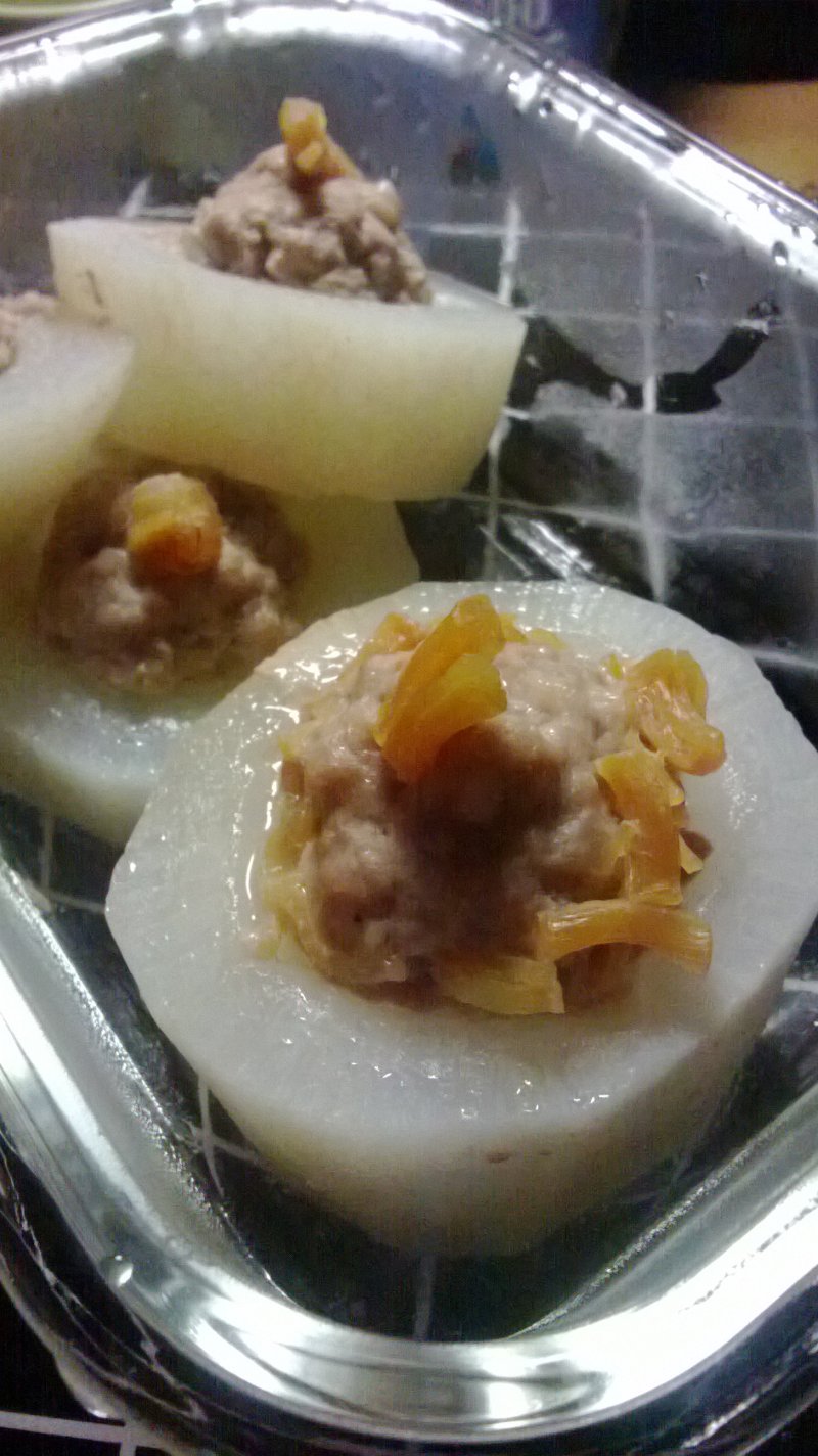 5:好了,现在把一个做好的萝卜肉球放到蒸锅上隔水蒸,大概二十分钟。由于本人条件限制,当时并没有隔水蒸,而是放了一点点水煮,不过这样放在下面的萝卜会软一点。如果隔水蒸的话可能之前萝卜要先出水。煮的时候家里会飘荡着很清香鲜甜的萝卜瑶柱味。