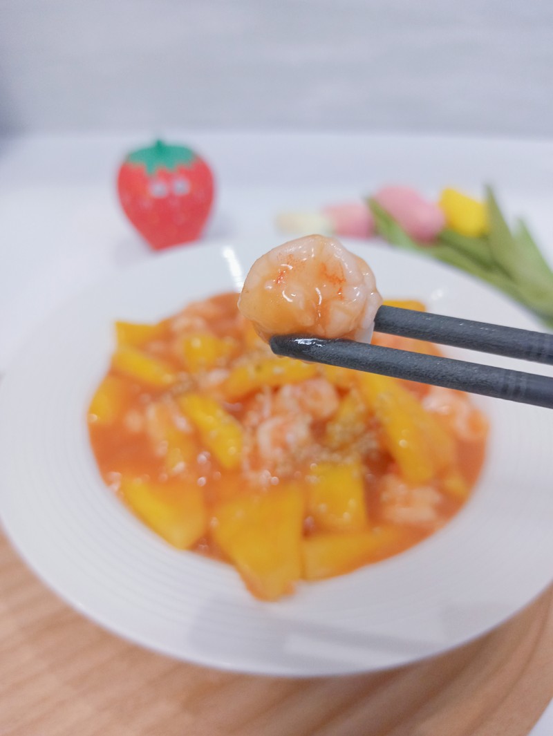 7:倒入青椒、菠萝丁和虾仁,均匀裹上酱汁出锅即可。