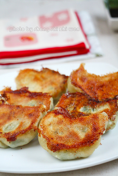 6:8.取一个饺子皮,放上搅拌好的馅料和1-2块虾仁包好。.取一个煎锅或是饼铛,放适量油加热至手放在锅上5-6CM处能明显感觉到热的程度,摆好饺子,小火煎2分钟后倒入一碗清水,盖上锅盖小火煎10-15分钟。或者用一深锅加入清水煮开后放入饺子,中火再次煮开后转小火保持水在微开的状态盖上锅盖煮10-15分钟即可。