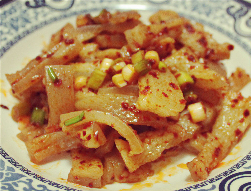 7:取辣椒油1勺,酿造酱油半勺,盐半勺,味精少量。与之前准备好的猪皮和葱花一起拌好。简单美味又富含胶原蛋白的香辣猪皮就做好了。