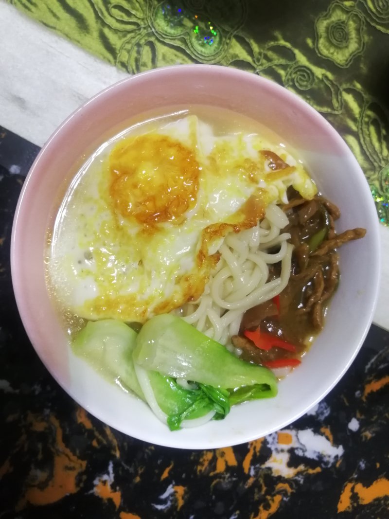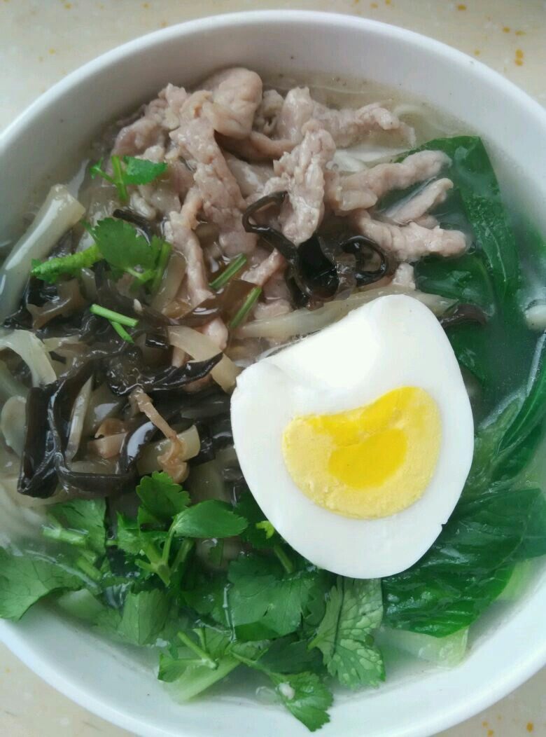 8:下好的面,浇上汤头放入炒好的肉丝、榨菜丝、木耳丝,烫好的小青菜,鸡蛋。撒上香菜,滴几滴香油既成。