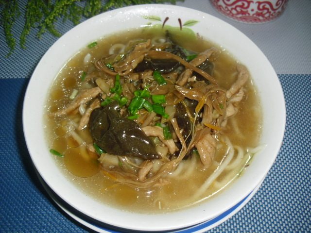 面条适量;榨菜适量;瘦肉适量;黑木耳适量;黄花菜适量;小葱适量;