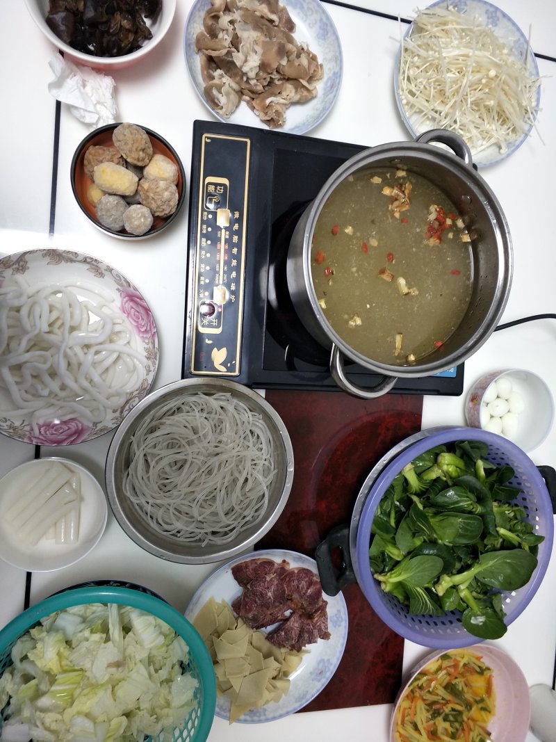 牛肉适量;百叶适量;牛肉卷适量;金针菇适量;莴笋适量;鹌鹑蛋适量;粉丝2把;土豆粉一小包;青菜适量;白菜适量;木耳适量;年糕适量;各种丸子适量;