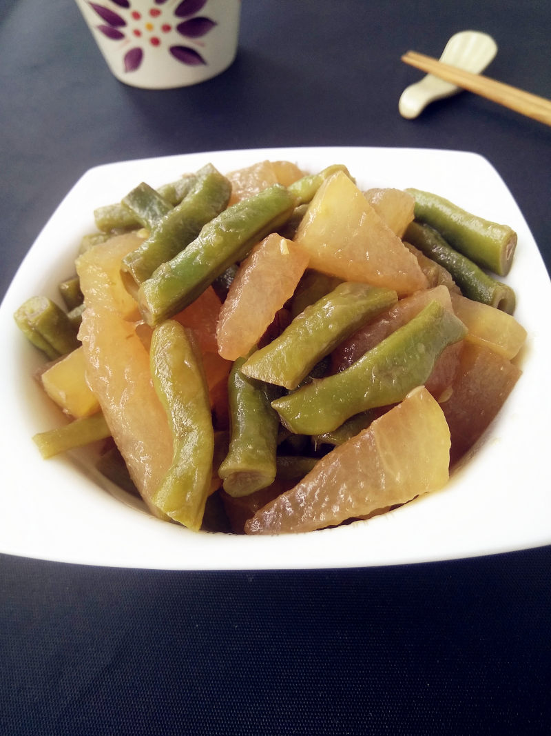 3:加入冬瓜翻炒,加入半勺糖,一勺生抽,盐,加少许水