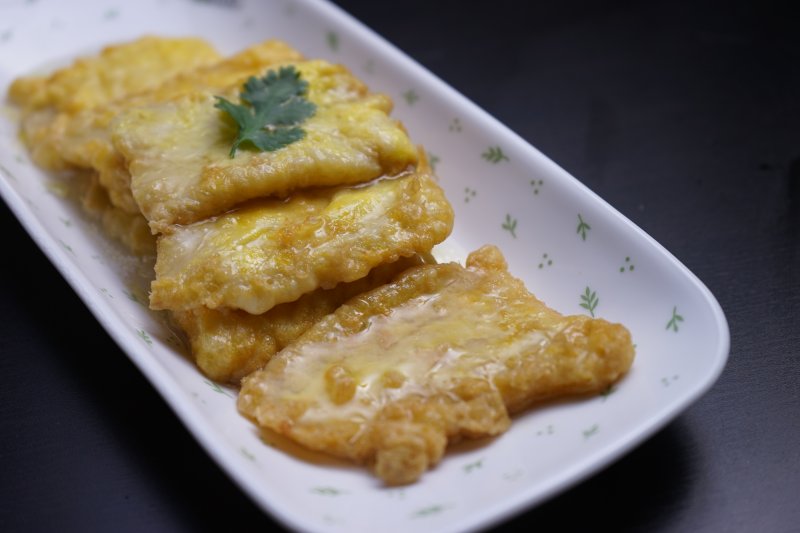 3:热锅入油,将挂好糊的鱼片炸至金黄