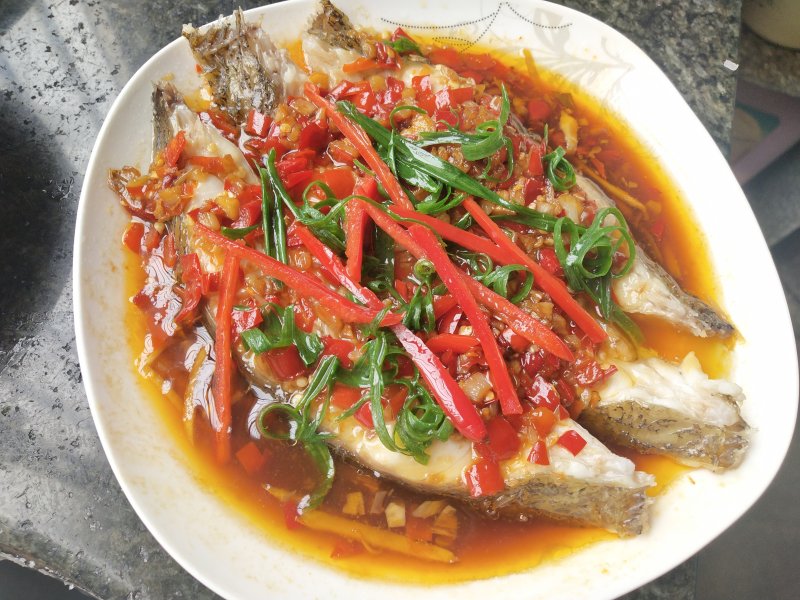 10:在盘子里撒上葱丝和红椒丝点缀,热锅烧油,油冒烟后浇到葱丝上。