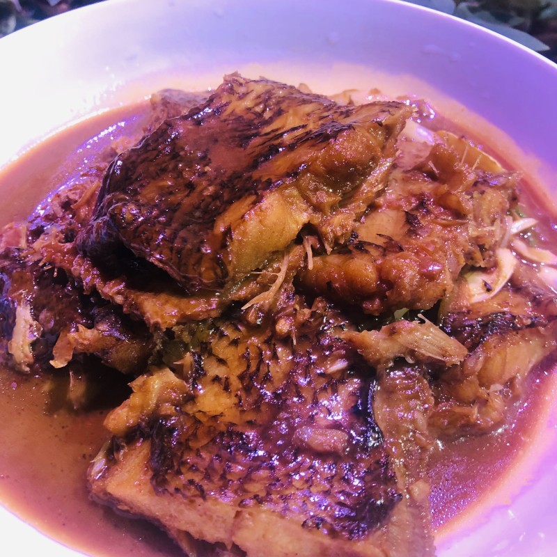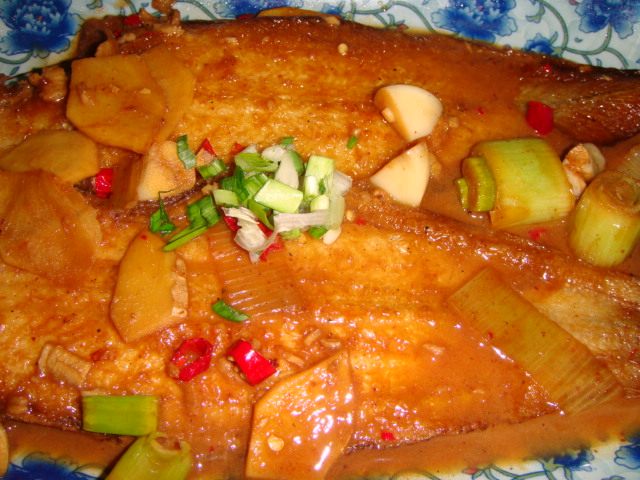 5:当鱼煎制两面金黄时,倒入调制后的调料,稍后再倒入啤酒,啤酒的量已抹过鱼身为界。因为酱和生抽都是咸的,所以可以不用加盐。大火烧至约10分钟左右,收汁出锅
